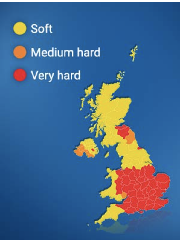 イギリスは軟水か硬水かという問いに対しては、図からもあきらかのようにイギリスの主要地域は硬水です。そのため、洗濯時には硬水を軟水化するものが必要になります。安価な重曹で代用する事もできますが、吸湿性が高くすぐ固まってしまう事、粉塵吸入による呼吸器疾患のリスクを考えると、カルゴンを買ってしまった方がよいと私は思います。